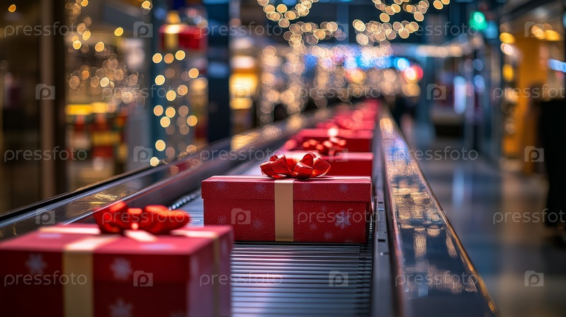 Красочные подарки движутся по конвейерной ленте в окружении сверкающих праздничных огней и украшенной рождественской елки, создавая праздничный дух