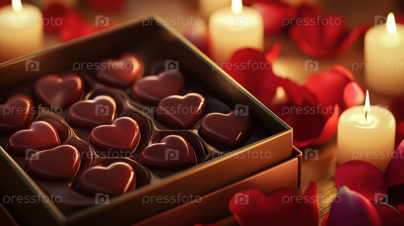 Захватывающая сцена любви ко Дню святого Валентина с шоколадными сердечками и свечами
