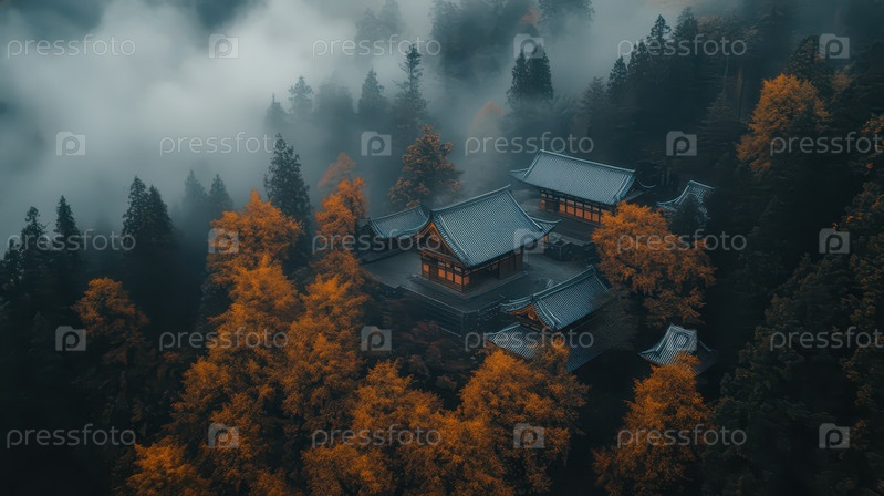 Традиционный японский храм в туманном лесу