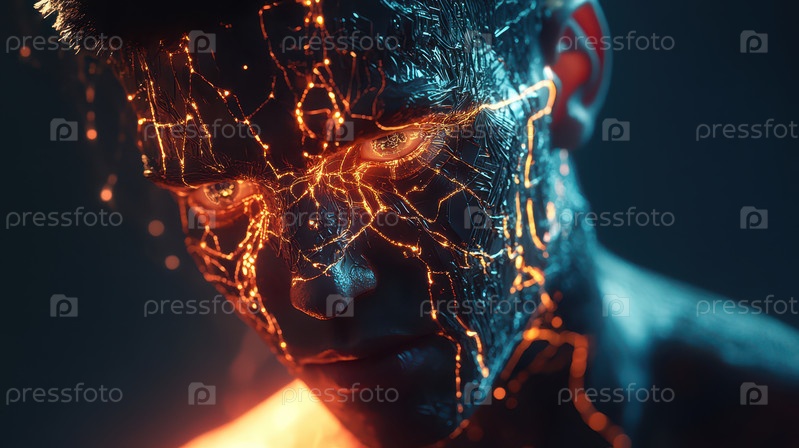 Футуристический киборг со светящимся нейросетевым лицом