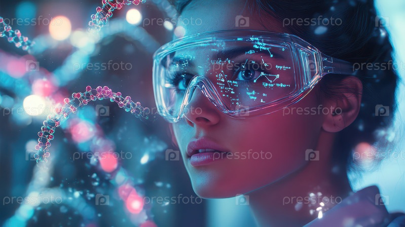 Женщина-ученый с цепочкой ДНК в лабораторных условиях