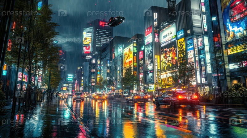 Киберпанк-городской пейзаж ночью с неоновыми огнями и дождем