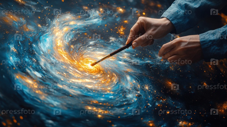 Создание космических чудес: руки создают золотую иллюстрацию галактики