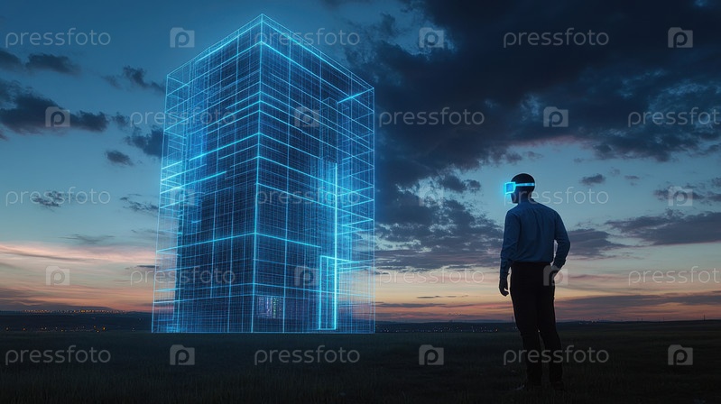 Погружение в виртуальную реальность с футуристическим голографическим зданием на закате