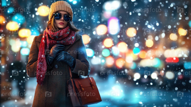 Модная женщина в черном пальто, шарфе и солнцезащитных очках идет по мягко падающему снегу в зимнем городе на фоне светящихся городских огней