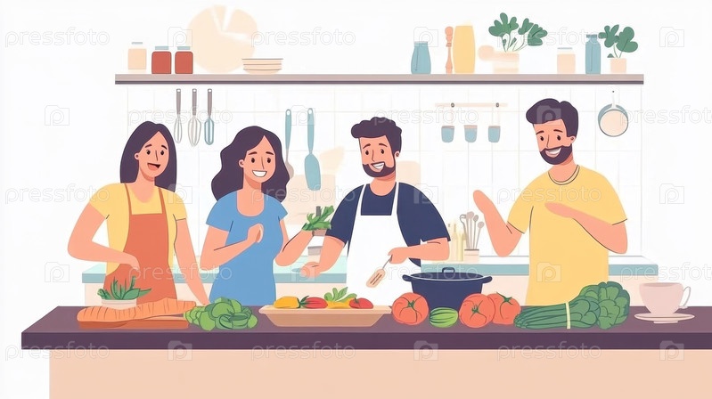 Иллюстрация друзей, готовящих вместе на современной кухне
