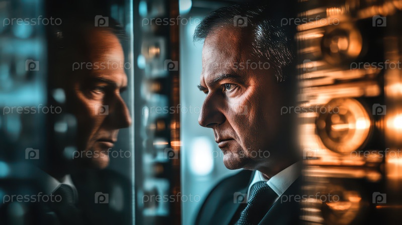 Бизнесмен перед дверью хранилища с наличными в двойной экспозиции