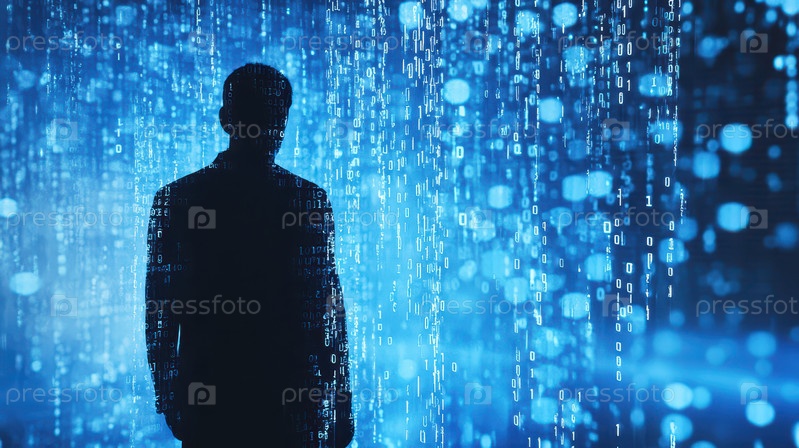 Силуэт человека, окруженного цифровым двоичным кодом