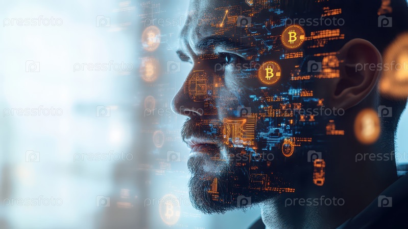 Цифровая двойная экспозиция биткоина и человеческого профиля