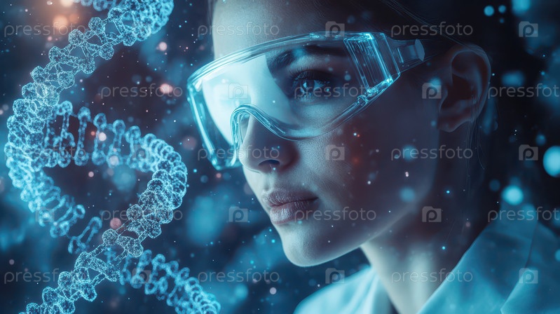 Женщина-ученый с цепочкой ДНК в лабораторных условиях
