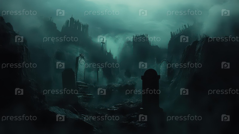 Туманное старое кладбище с надгробиями ночью