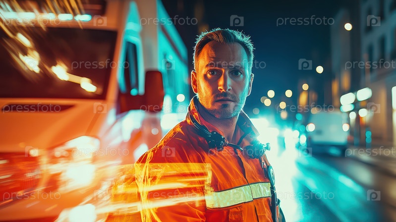 Фельдшер в оранжевой форме с машиной скорой помощи и аварийными огнями