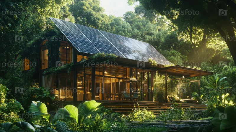 Экологичный дом с солнечными панелями в пышном зеленом лесу