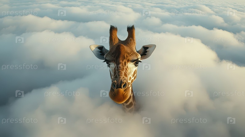 Сюрреалистическая сцена жирафа, появляющегося из густых облаков, на фоне туманных гор, создающая сказочную и причудливую атмосферу