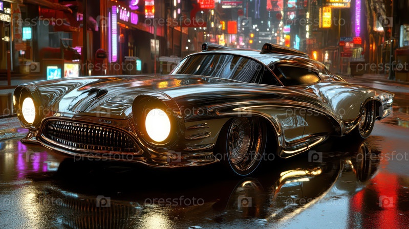 Классический автомобиль в стиле киберпанк в Неоновом городе