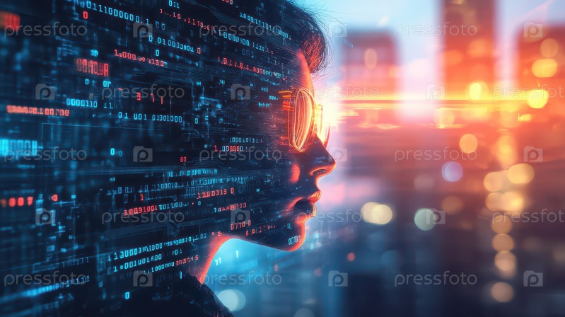 Женский киберпрофиль с цифровым кодом и неоновым световым отражением