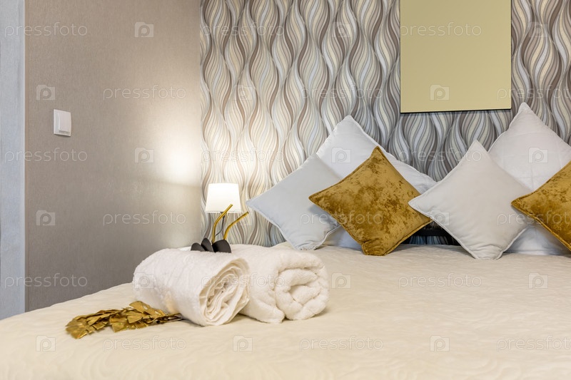 Крупным планом изображена уютная кровать с мягкими подушками в теплых тонах, свернутыми полотенцами и декоративными элементами, создающими уютную и комфортную атмосферу