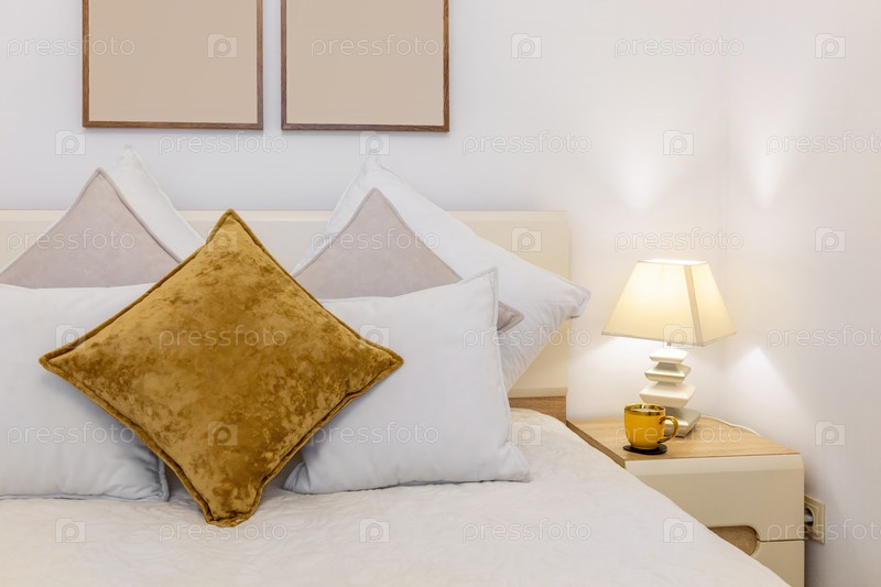 Уютная кровать с мягкими белыми и желтыми подушками, стильная тумбочка с лампой и желтая кофейная чашка создают теплую и уютную атмосферу