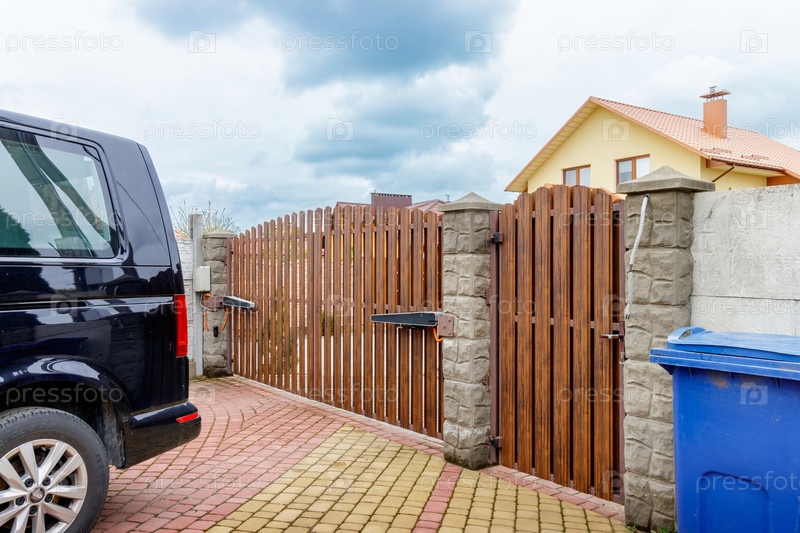 У въезда на подъездную дорожку стоят деревянные ворота с каменными столбами, а рядом с аккуратно вымощенной дорожкой припаркован черный автомобиль