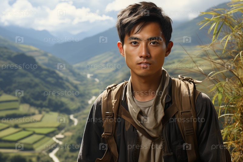 Азиатский молодой человек на фоне долины с сельскохозяйственными террасами