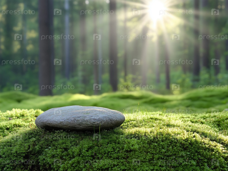 Камень на мху в лесу с солнечными лучами