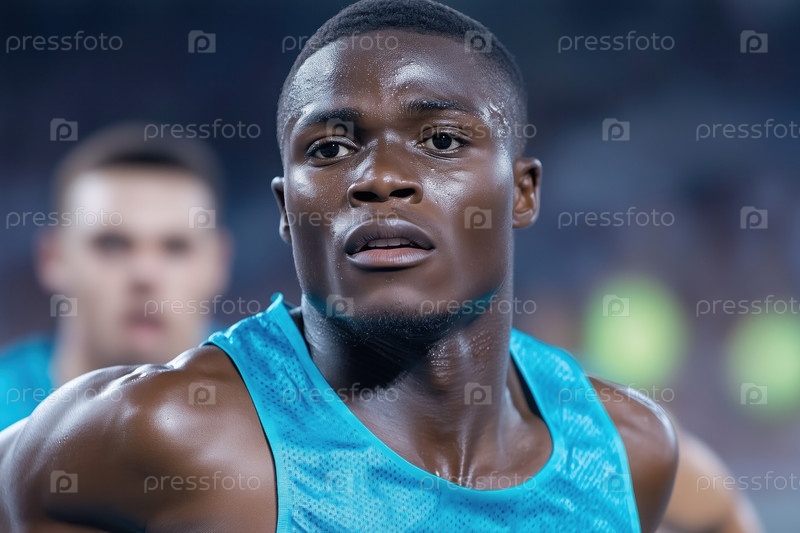 Портрет мужчины-спортсмена, смотрящего в камеру, стоящего на соревнованиях по легкой атлетике