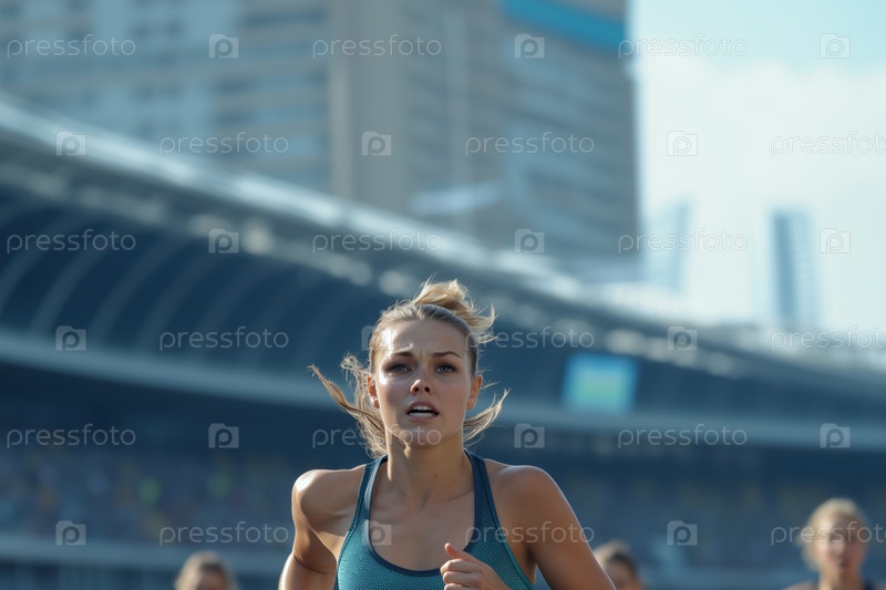 Спортсменка бежит по стадиону во время соревнований