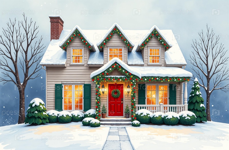 Фасад дома, вечер, снежная зима, рождественская гирлянда, канун Нового года. Создано с помощью искусственного интеллекта