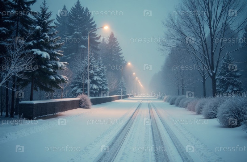 Дорога в лесу, зимний снег, елки стоят на улице, снегопад. Создано ИИ