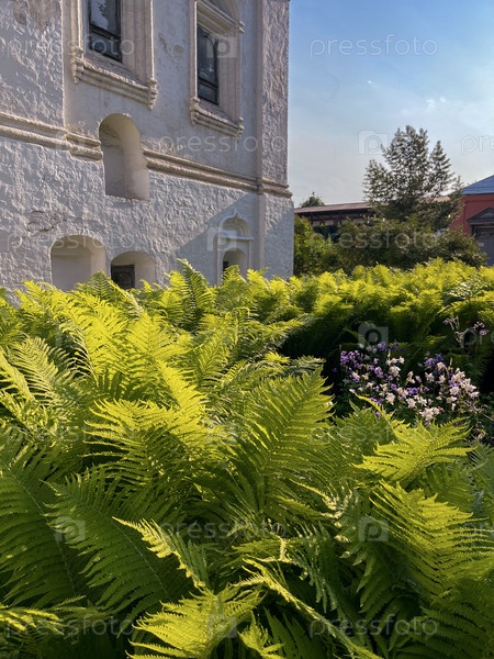 Зеленый папоротник растет у стен монастыря в июне