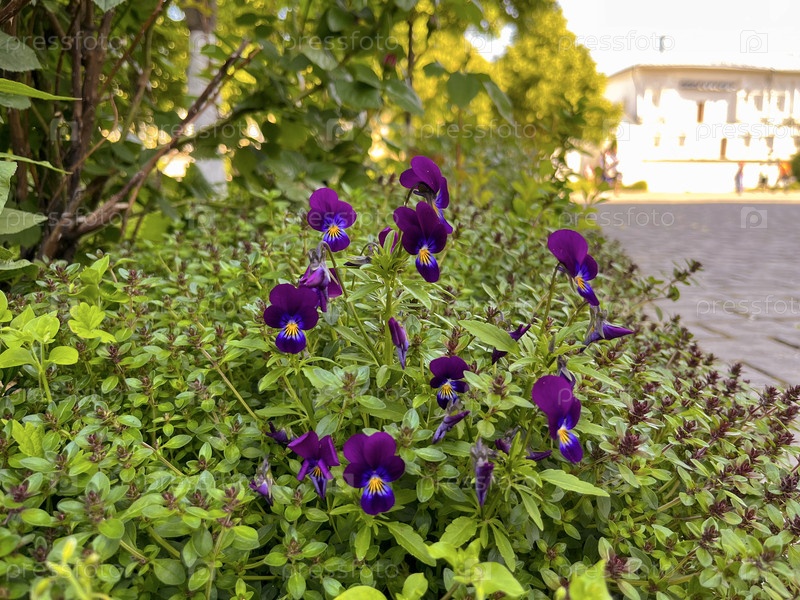 Маленькие цветы фиолетовые фиалки цветут на клумбе