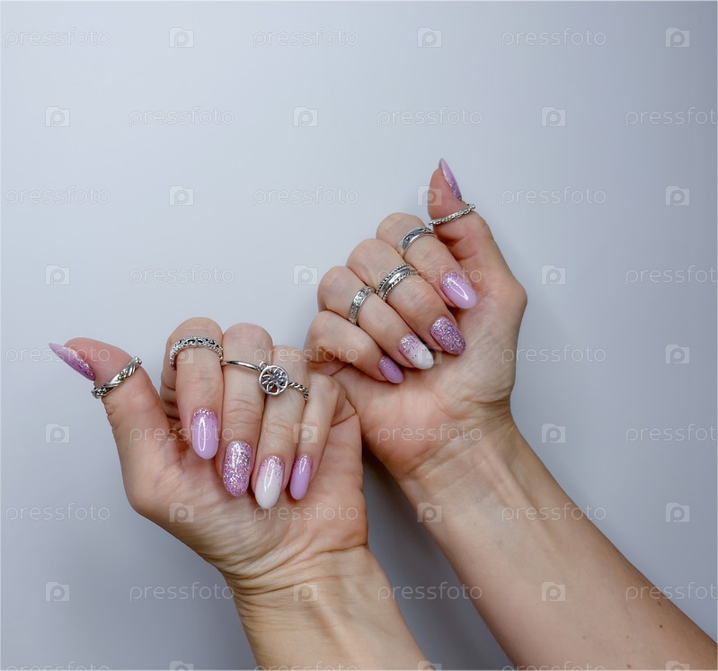 Женские руки с ногтями, покрытыми розовым блестящим лаком