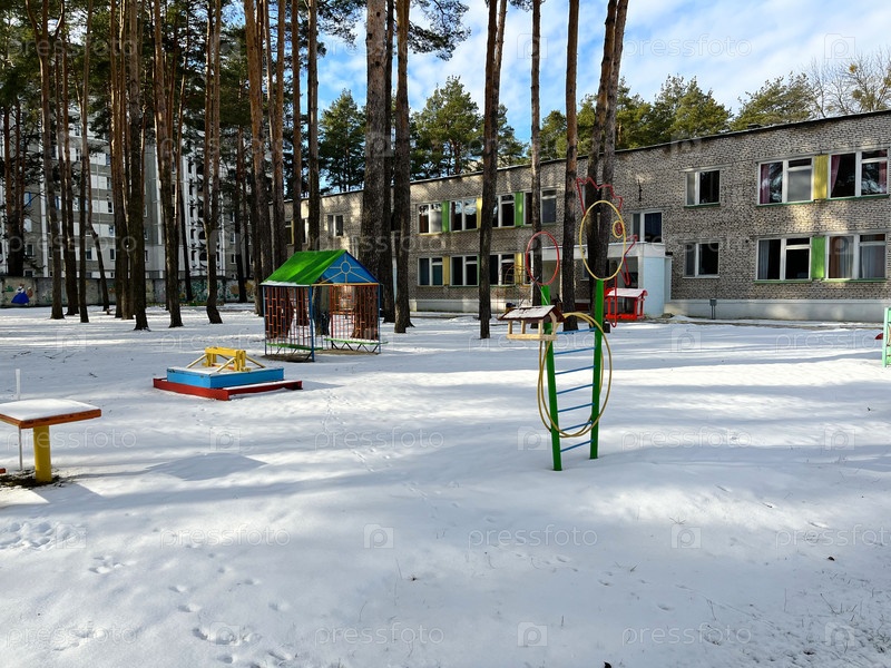 Территория детского сада с деревьями соснами и горками для детей зимой