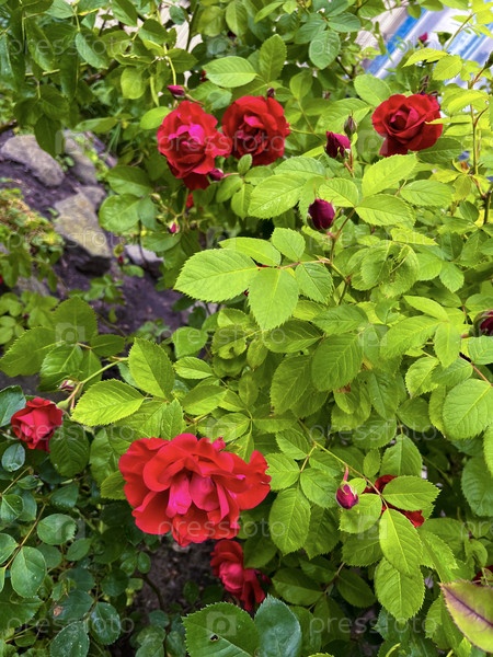 Красная плетистая роза цветет на городской клумбе