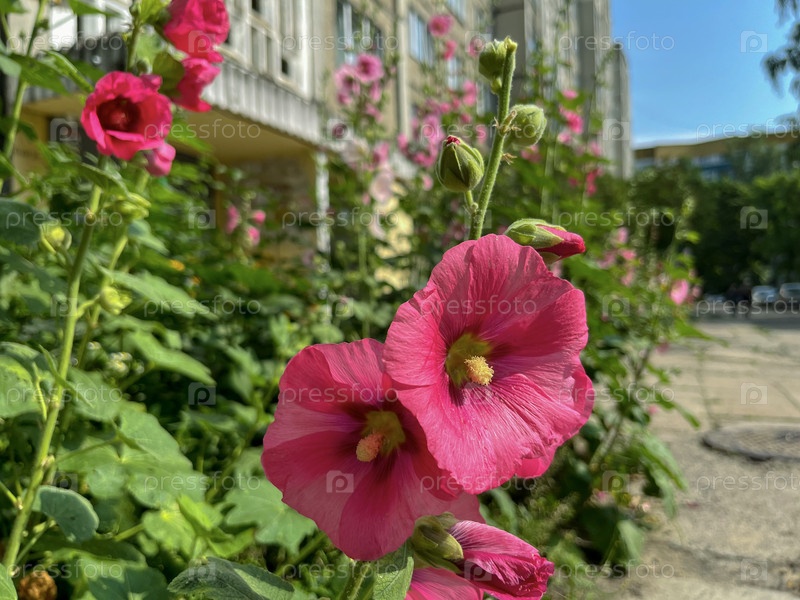 Цветет красивый красный цветок мальвы