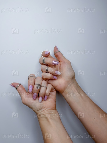 Женские руки с ногтями, покрытыми розовым блестящим лаком
