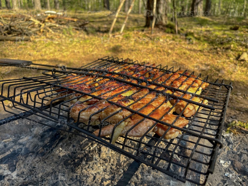 Летом мясо жарят на гриле в лесу на природе