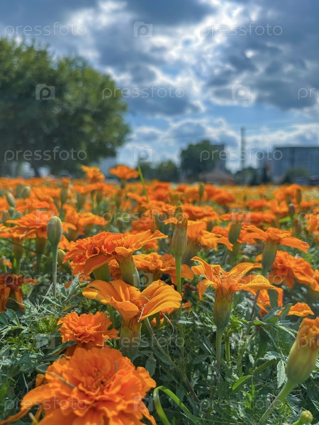 Цветы растут в городе на клумбах под голубым небом с облаками