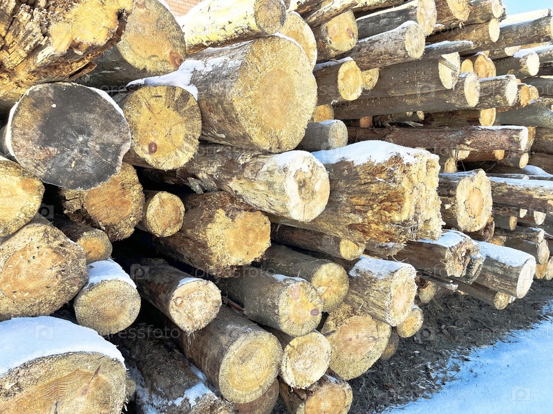 Сосновые дрова, сложенные на улице зимой под домом