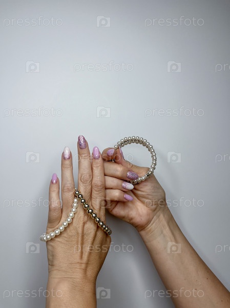 Женские руки с накрашенными ногтями на фоне украшений из серег, бус и браслетов
