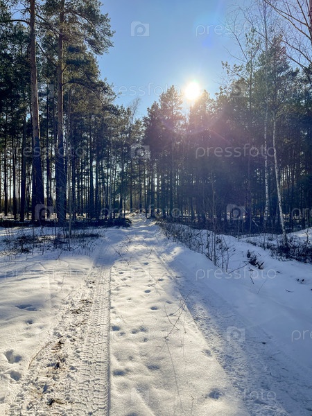 Зимний пейзаж в лесу - снег на деревьях и на земле