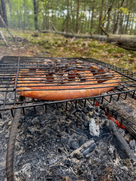 Мясо жарится на гриле в лесу на природе