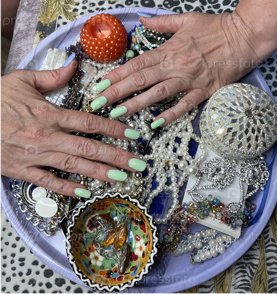 Женские руки с накрашенными ногтями на фоне украшений