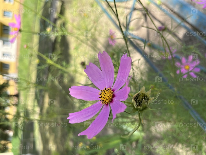 Летом в городе на клумбах под голубым небом с облаками растут цветы космеи