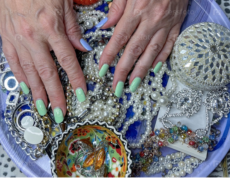 Женские руки с накрашенными ногтями на фоне украшений из серег, бус и браслетов