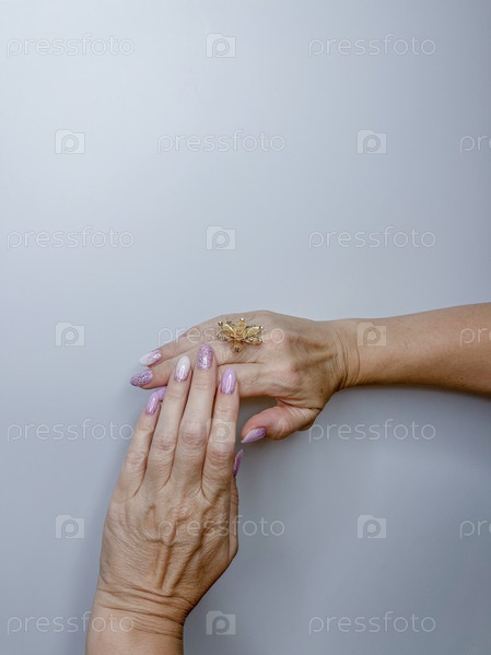 Женские руки с ногтями, покрытыми розовым блестящим лаком