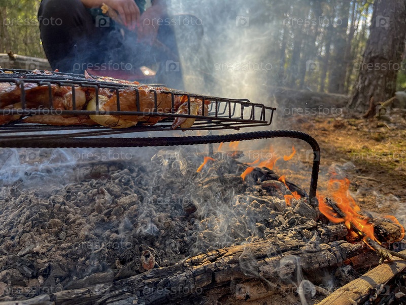 Мясо жарится на гриле в лесу на природе