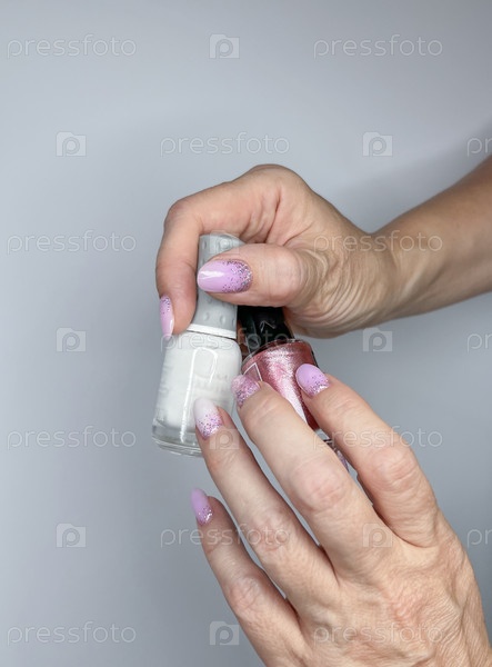 Женские руки с ногтями, покрытыми розовым блестящим лаком