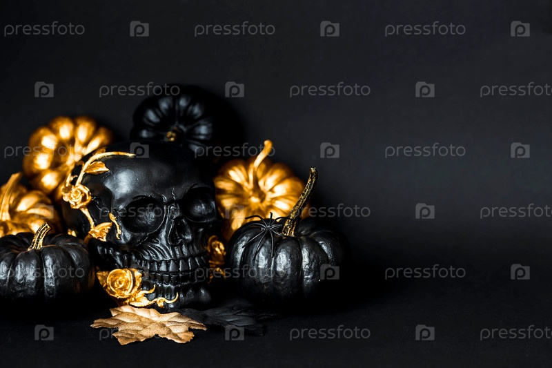 Таинственный черный череп с золотыми розами и тыквами для вечеринки в честь Хэллоуина или Дня мертвых на черном гранжевом фоне