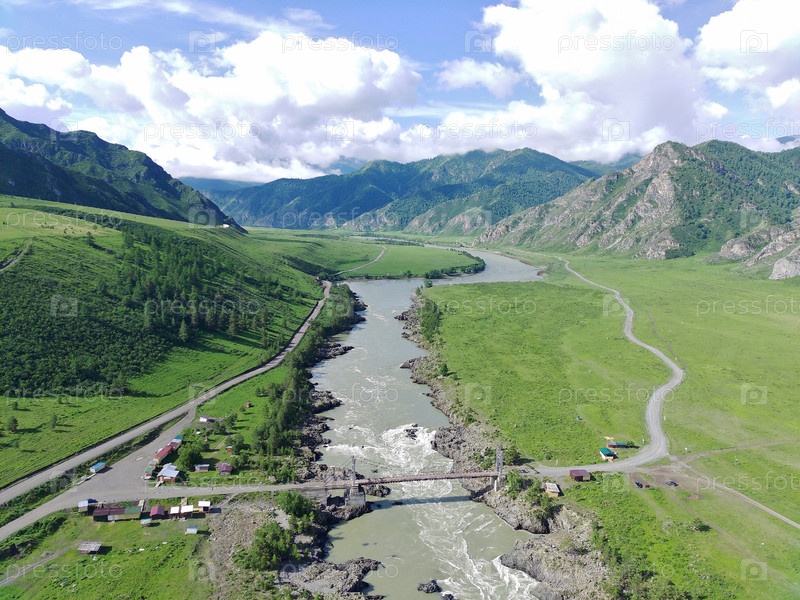 Вид с вертолета на Ороктойский мост, автомобильный висячий мост, река Катун. Республика Алтай. Горный Алтай. Чемал. Россия. 2024